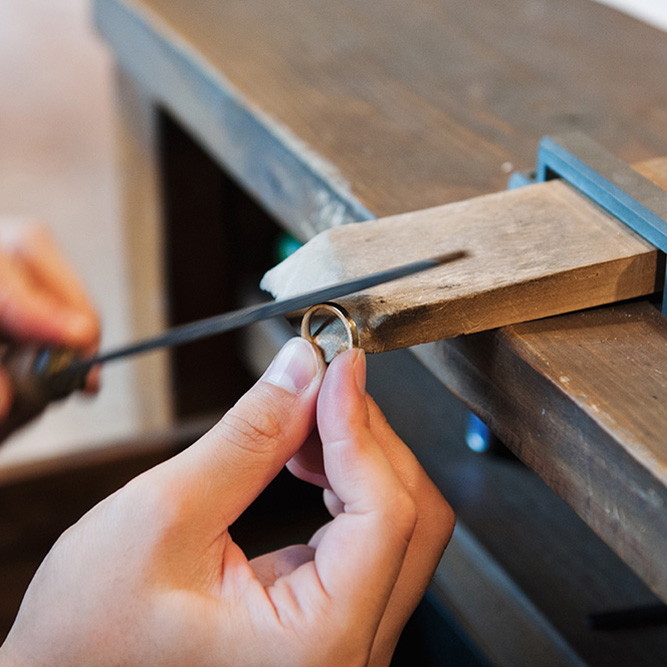 工房スミスは、その名の通り職人がお客様の大切な思い出のひとつに寄り添えるよう、東京・青山のアトリエで日々お待ちしています。手作り結婚指輪を通して見るお客様の嬉しい顔が、私たち職人の力の源です。